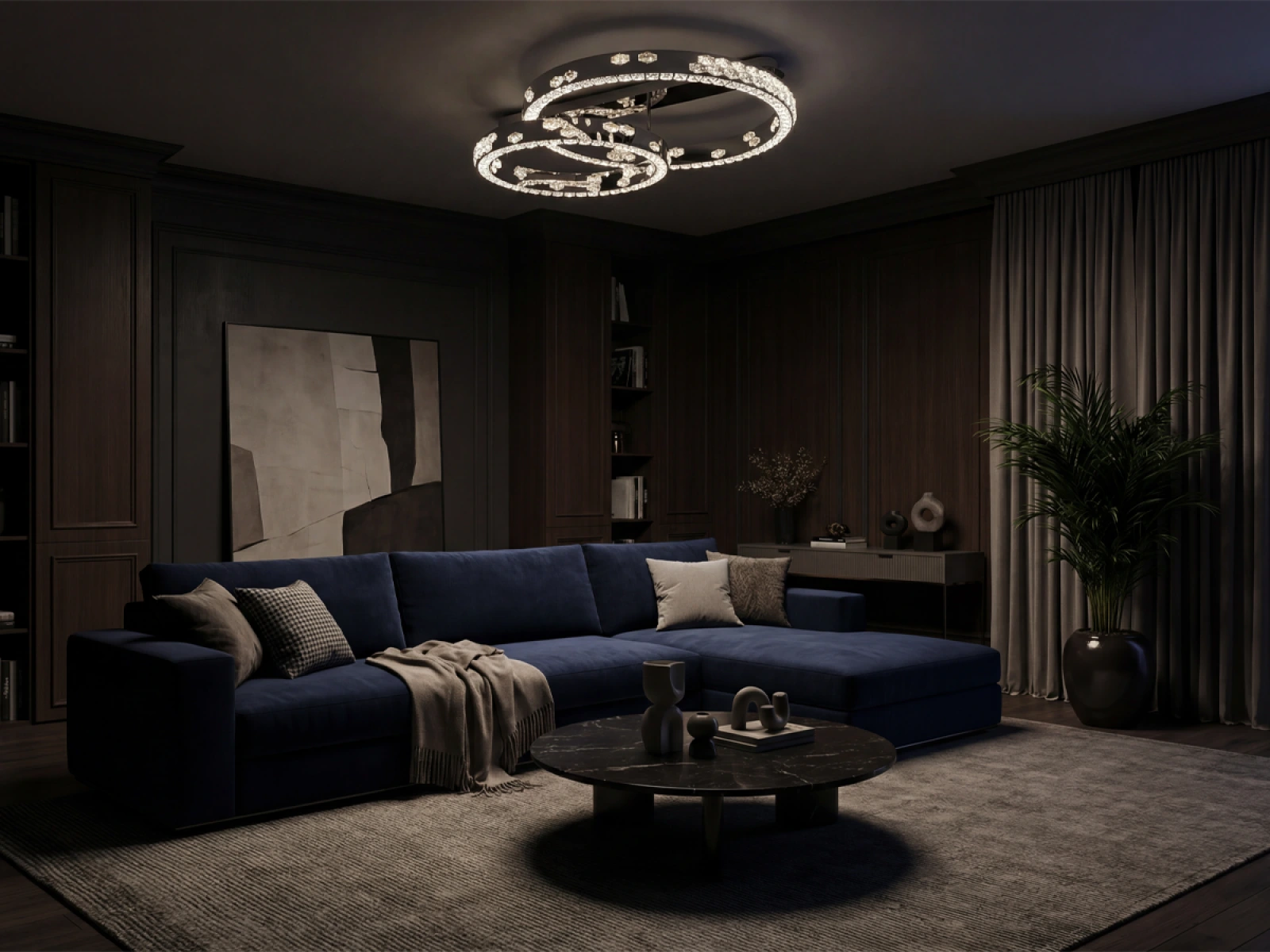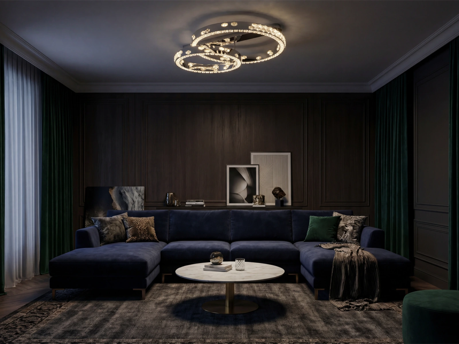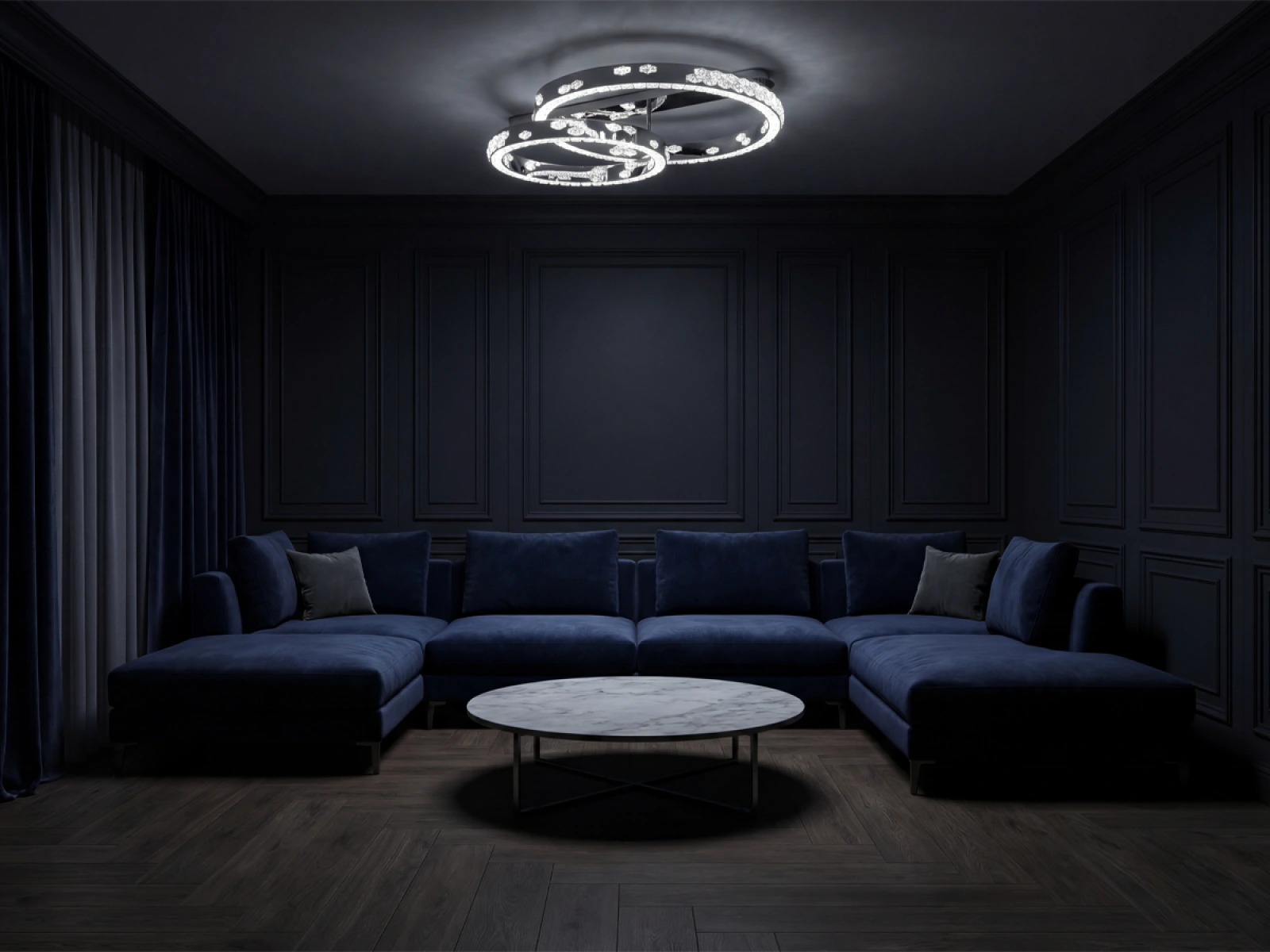Le luminaire est fabriqué en acier inoxydable de haute qualité avec une finition chromée, complétée par des cristaux taillés avec précision qui améliorent la réflexion et la réfraction de la lumière. La technologie de traitement utilisée garantit la stabilité à long terme du matériau et la préservation de son aspect esthétique.