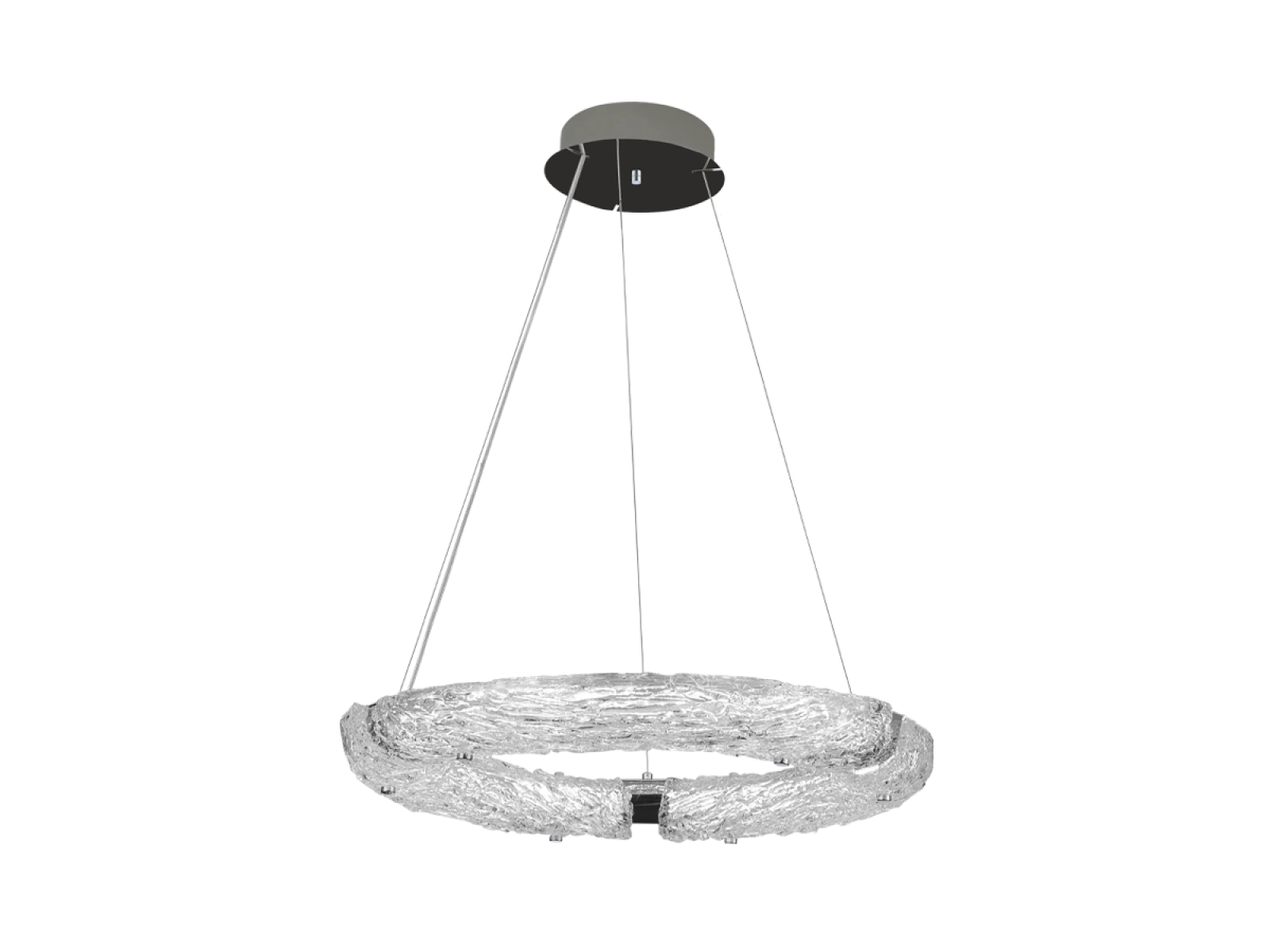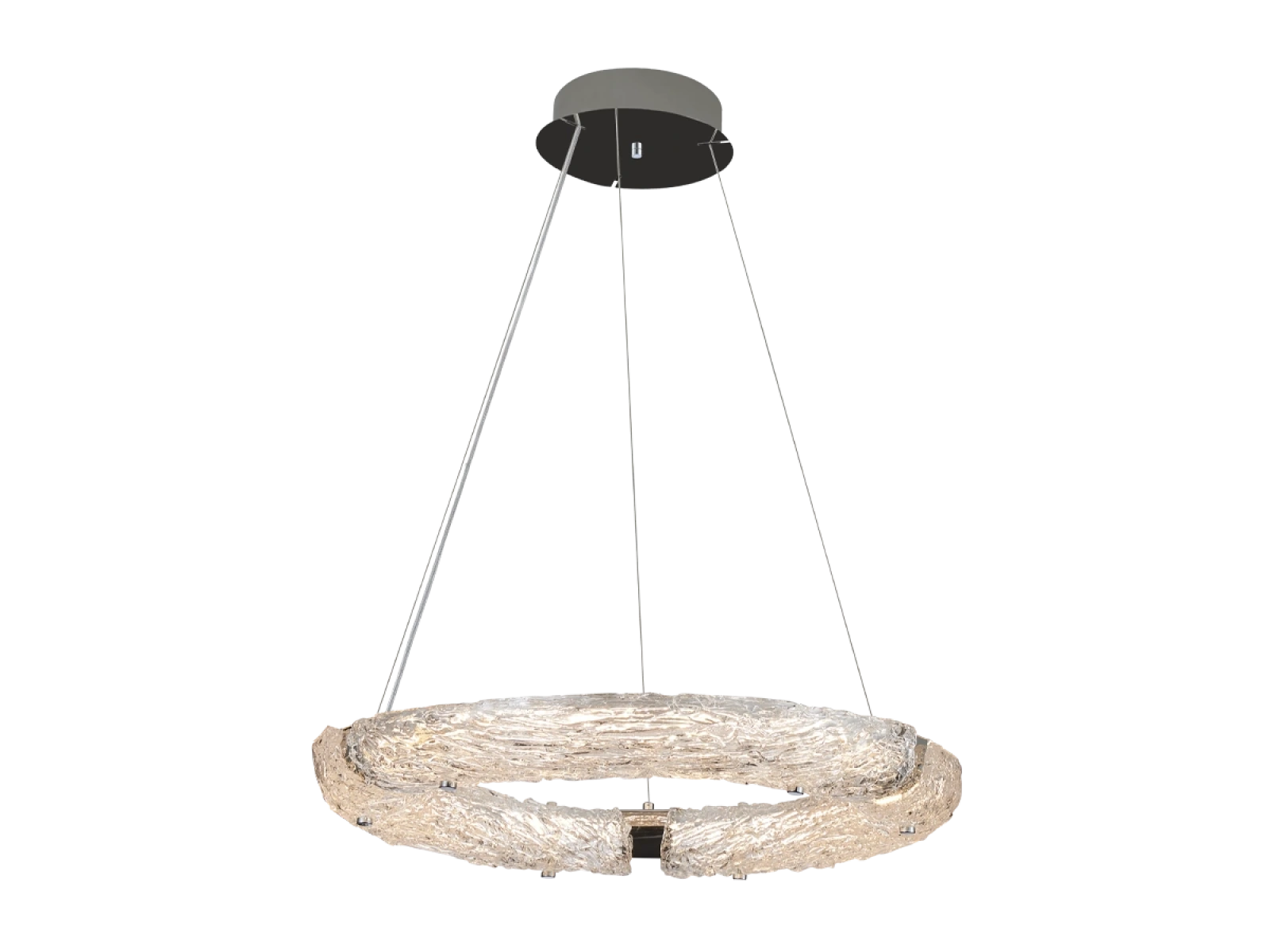 Le luminaire est fabriqué en acier inoxydable de haute qualité avec une finition chromée, ce qui garantit sa durabilité, sa stabilité et son aspect luxueux. Les éléments en verre avec une surface texturée inspirée de l'écorce assurent une diffusion homogène et agréable de la lumière.