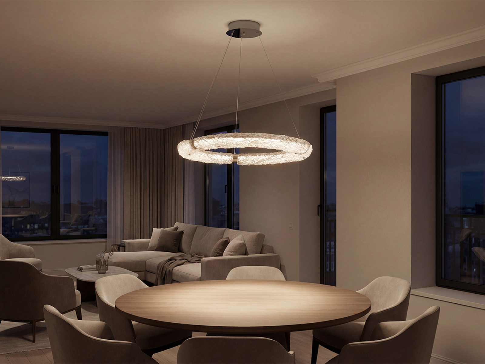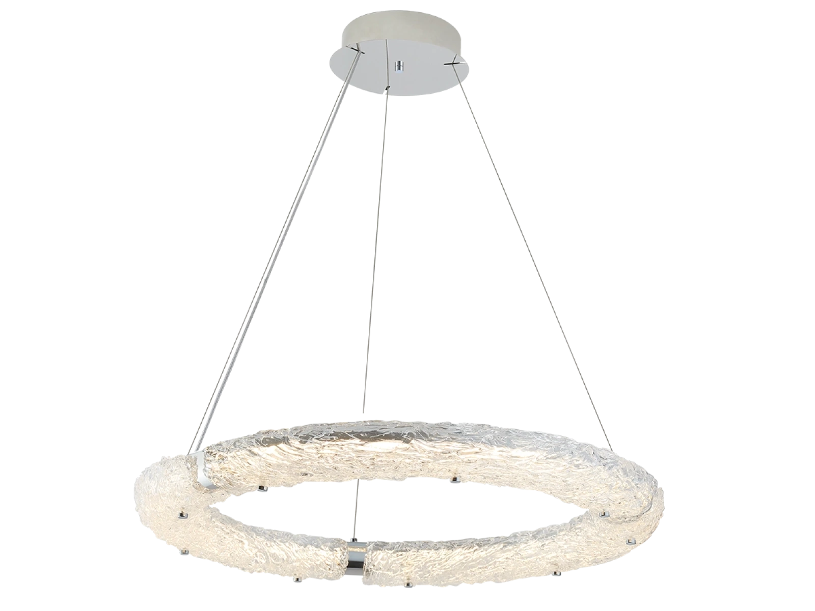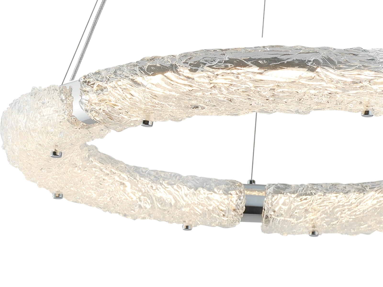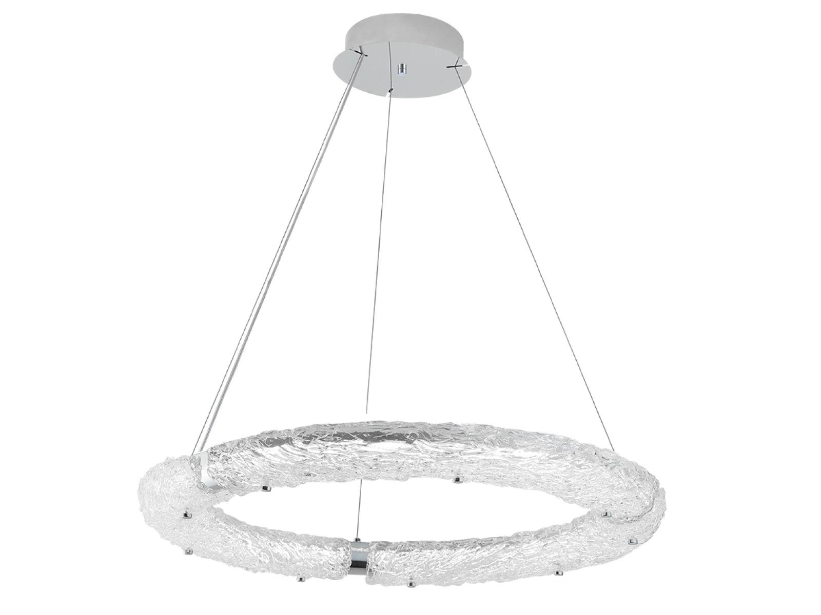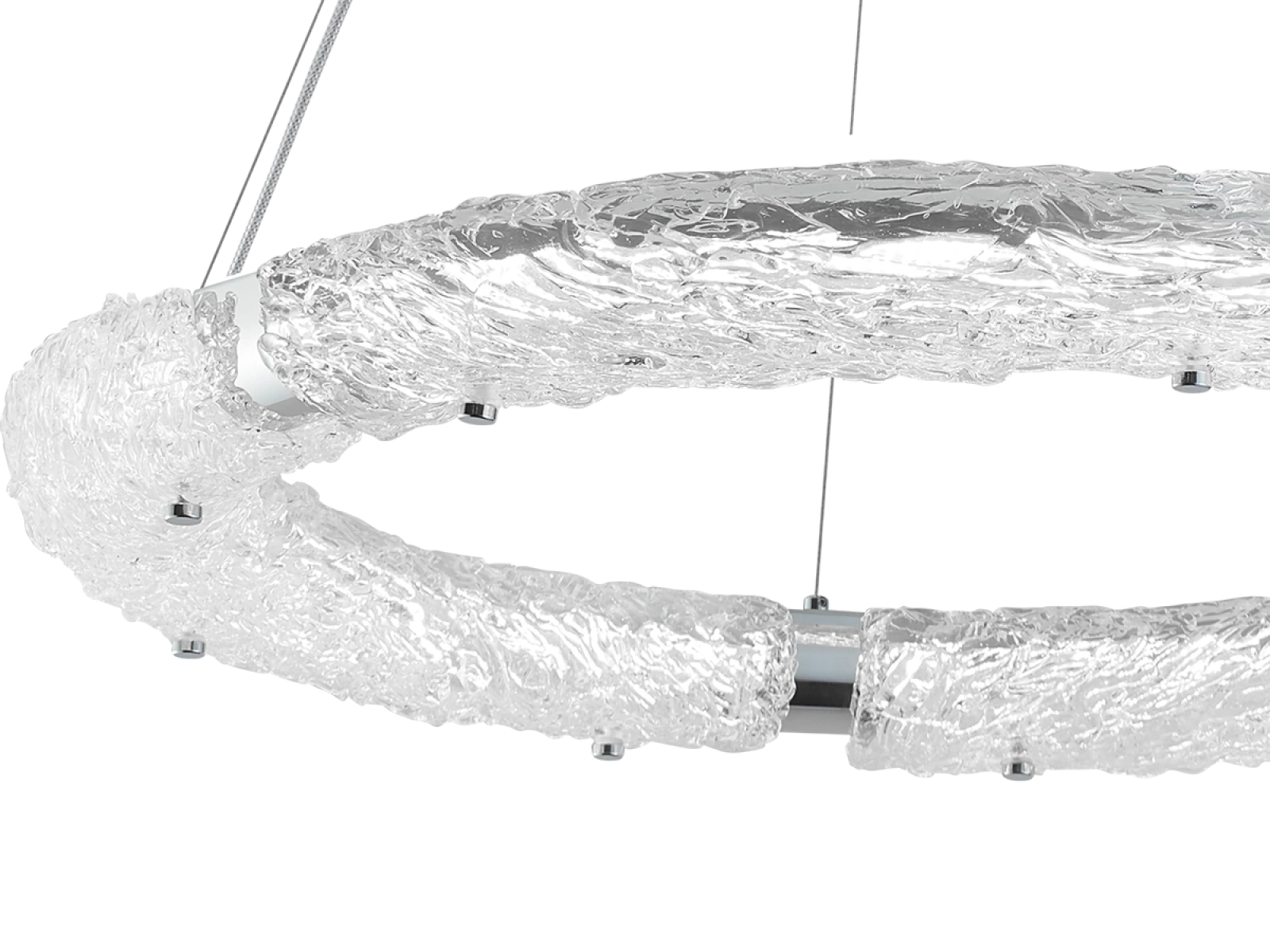 Svietidlo je vyrobené z vysokokvalitného nerezového kovu s chrómovou povrchovou úpravou, ktorá zabezpečuje dlhodobú odolnosť, stabilitu a luxusný vzhľad. Sklenené prvky so štruktúrovaným povrchom inšpirovaným kôrou zabezpečujú rovnomerný a príjemný rozptyl svetla.