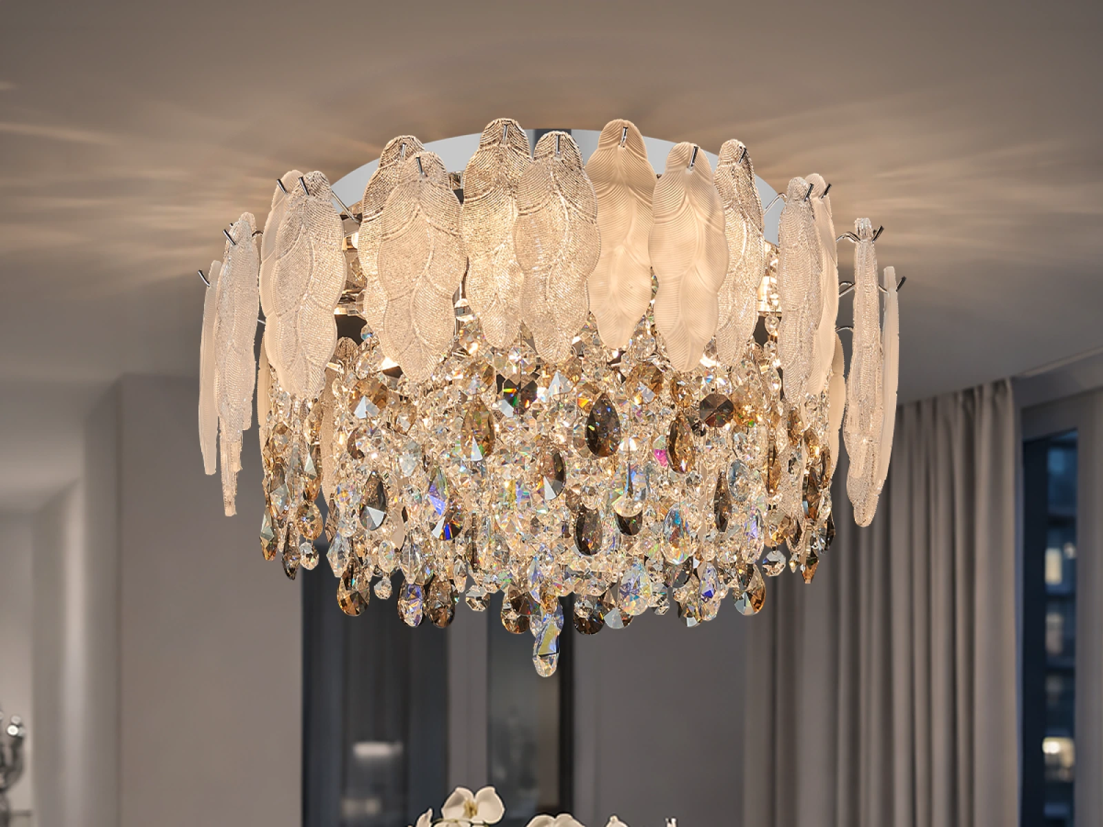 Le plafonnier GURU de VIZARDI est une combinaison harmonieuse d'élégance, de luxe subtil et de design moderne. Grâce à son aspect distinctif mais équilibré, il s'intègre naturellement dans les salons, les salles à manger, les chambres à coucher et les espaces représentatifs, où il crée une atmosphère accueillante et élégante.