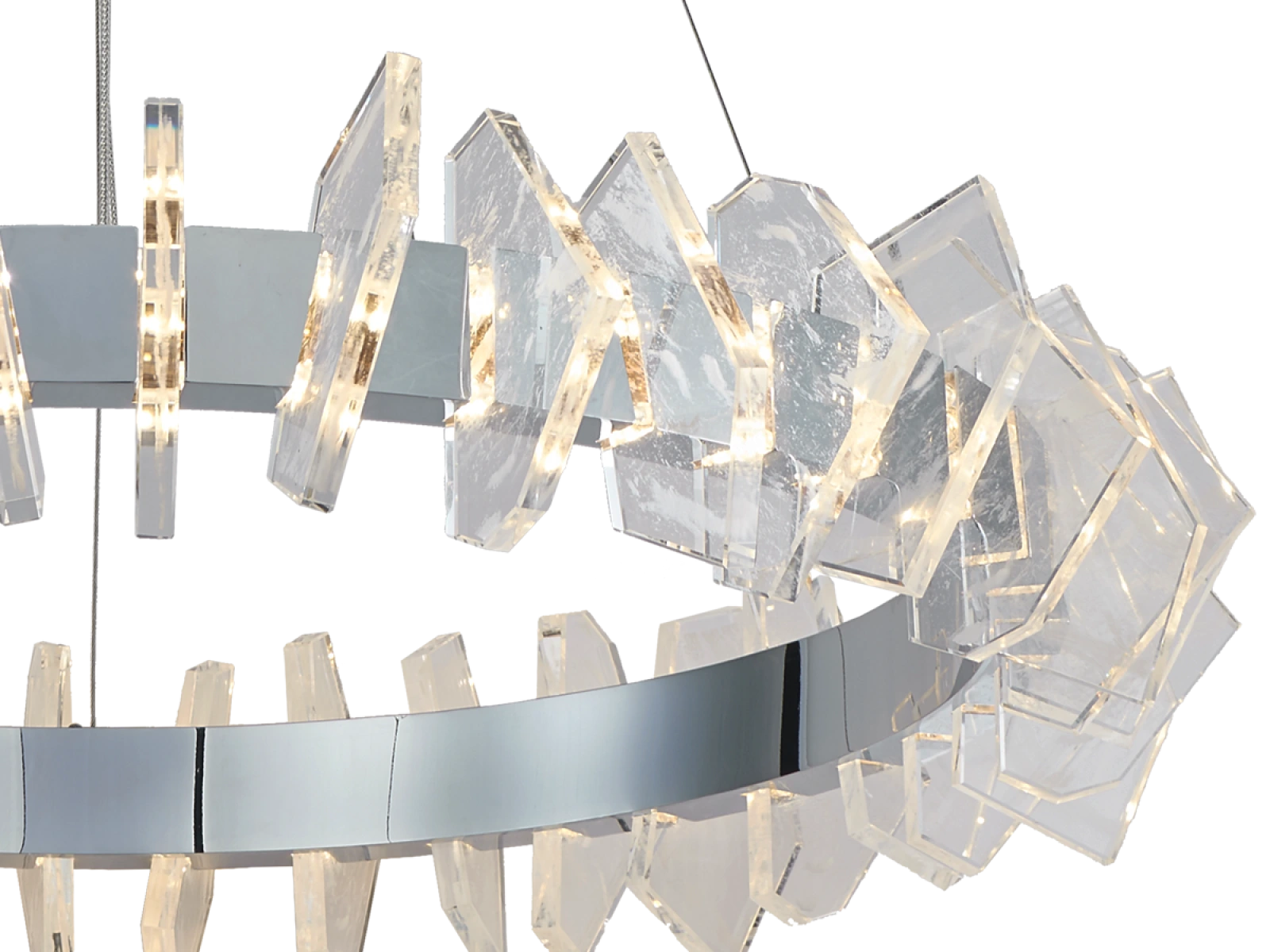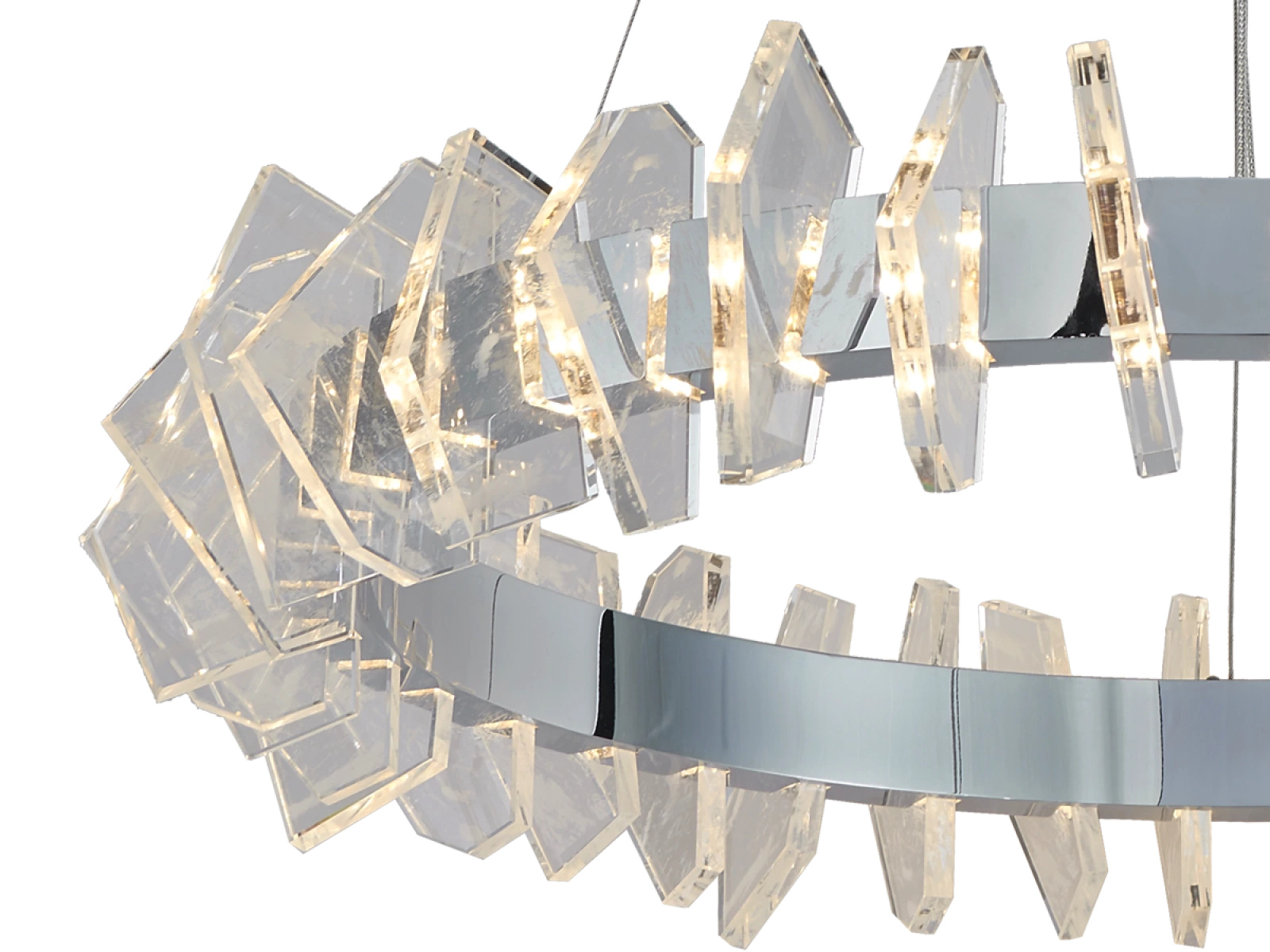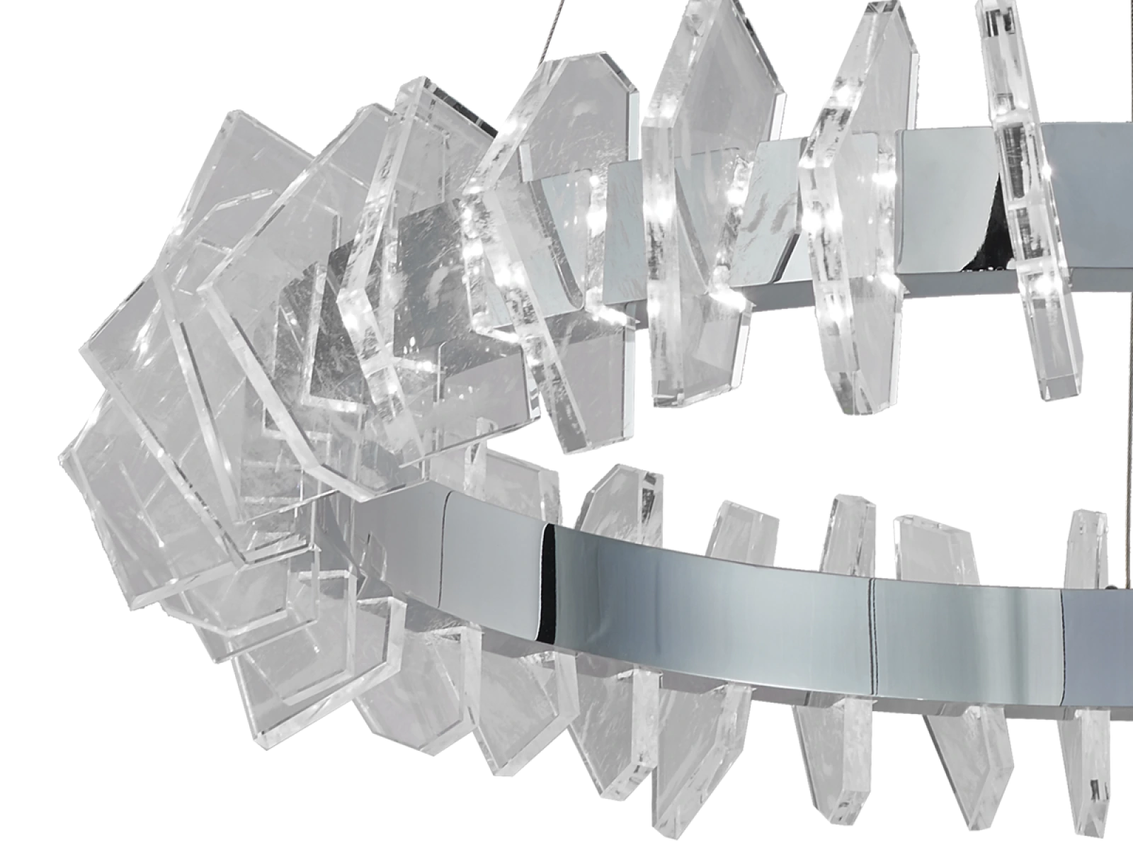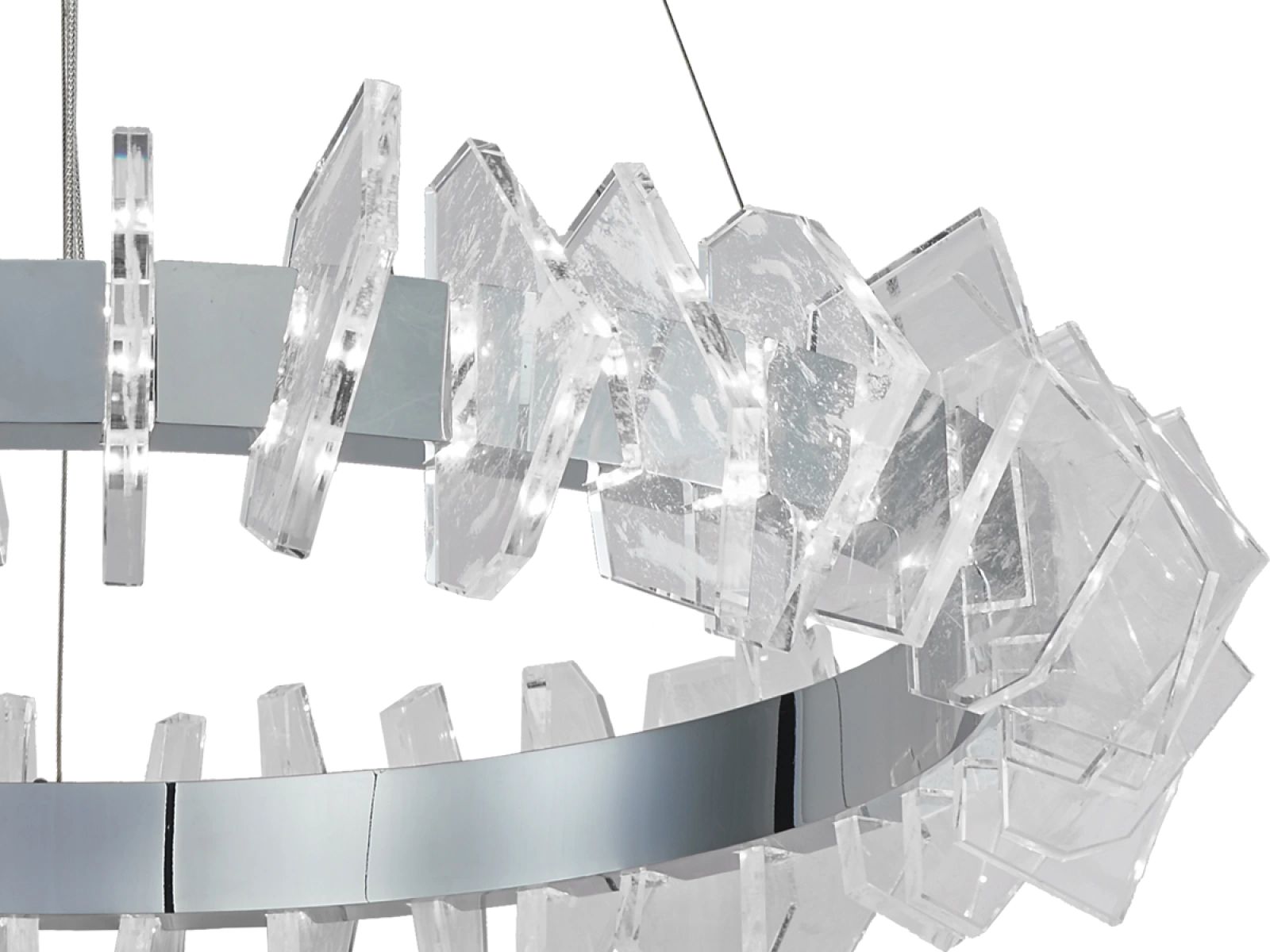 Konštrukcia je vyrobená z kvalitnej ocele s chrómovou povrchovou úpravou a doplnená o originálne usporiadané, precízne brúsené krištáľové prvky, ktoré zabezpečujú intenzívny lom a odraz svetla. Výsledkom je luxusná svetelná atmosféra s výrazným dekoratívnym efektom, ktorá podčiarkne charakter moderného aj reprezentatívneho interiéru.