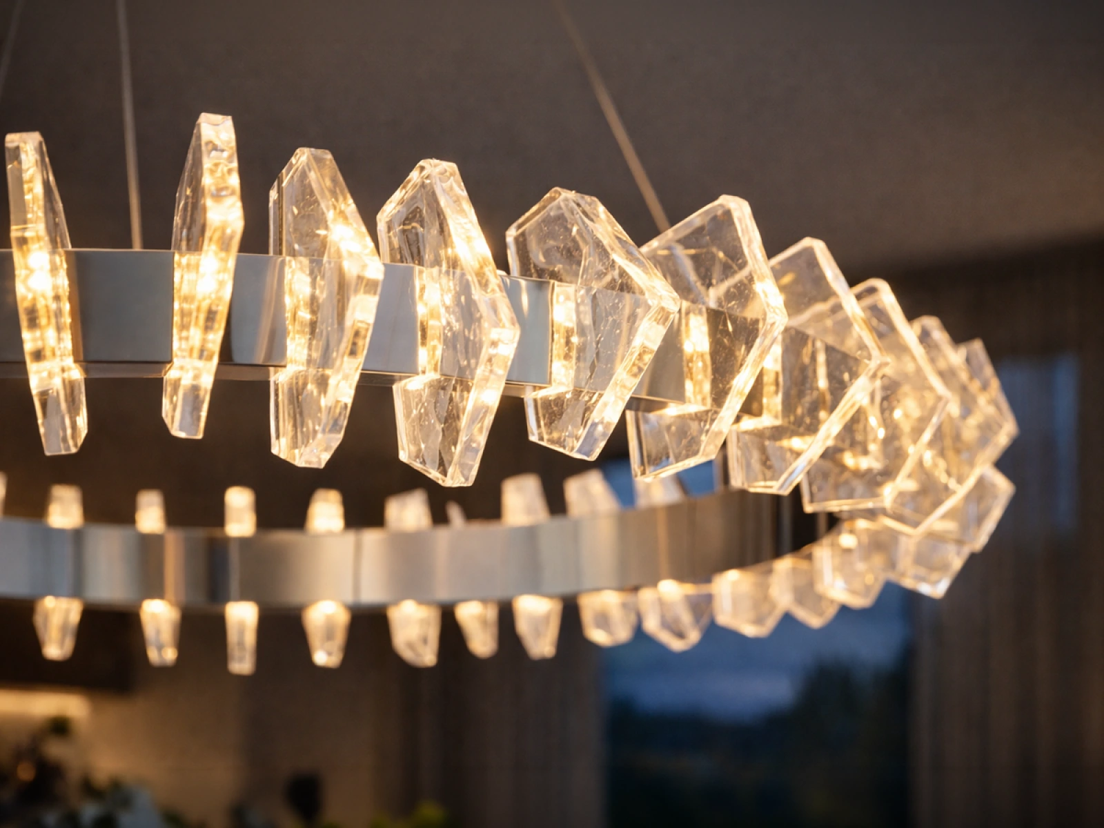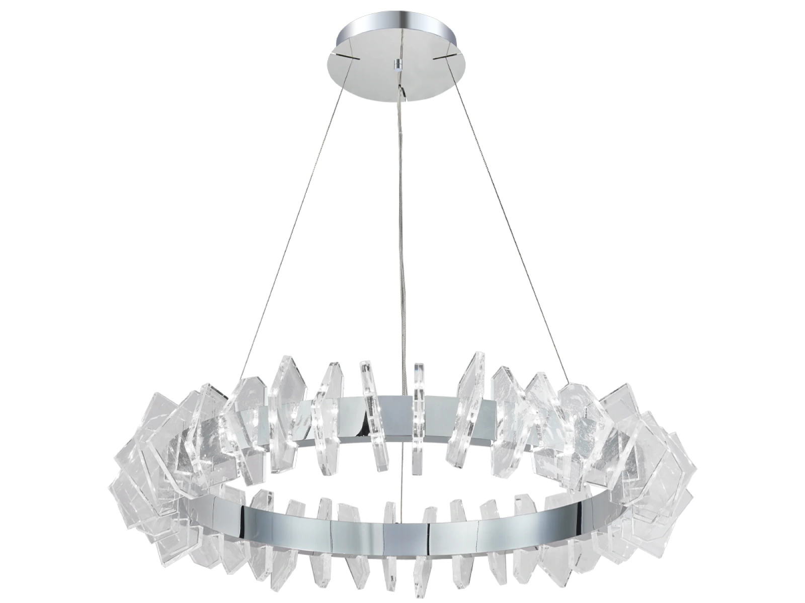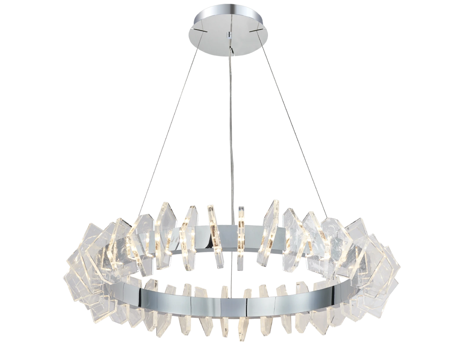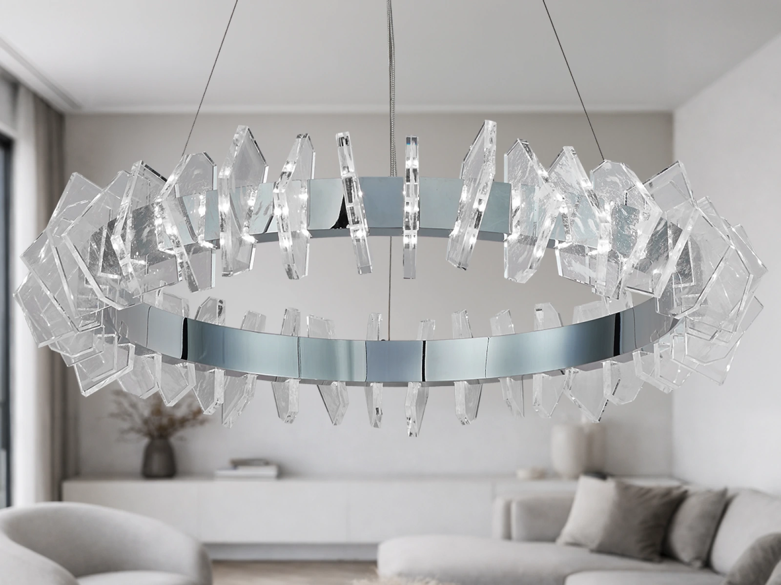 Konštrukcia je vyrobená z kvalitnej ocele s chrómovou povrchovou úpravou a doplnená o originálne usporiadané, precízne brúsené krištáľové prvky, ktoré zabezpečujú intenzívny lom a odraz svetla. Výsledkom je luxusná svetelná atmosféra s výrazným dekoratívnym efektom, ktorá podčiarkne charakter moderného aj reprezentatívneho interiéru.